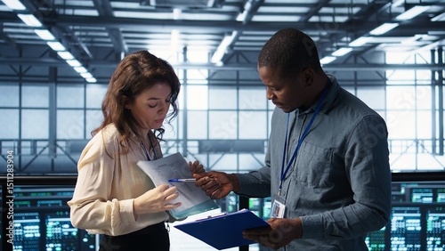 Fototapeta premium Team of data center supervisors reading paperwork files, reviewing system diagnostics. Server room coworkers looking over maintenance schedules documents and cybersecurity protocols