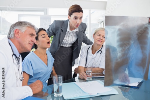Fototapeta premium Team of doctors and businesswoman examining xray