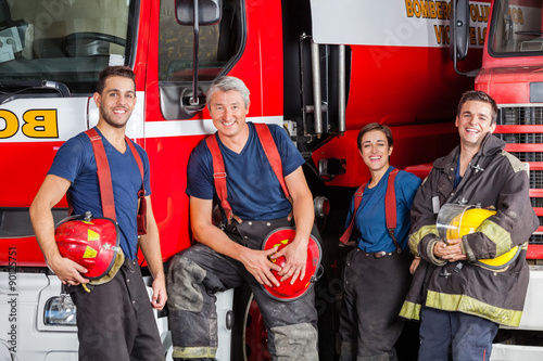 © Tyler Olson, Fototapeta premium Team Of Happy Firefighters At Fire Station