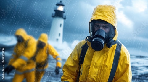 Naklejka premium Team of responders in yellow rain gear working in stormy conditions with lighthouse behind