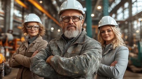 © Evgenii, Fototapeta premium team of three construction workers stands confidently in a busy warehouse