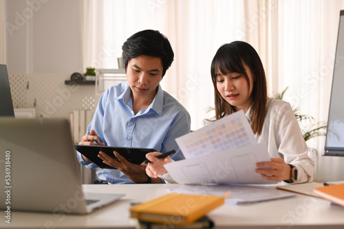 © Prathankarnpap, Obraz premium Team of web designers collaborating and developing template layout for mobile application in creative workplace