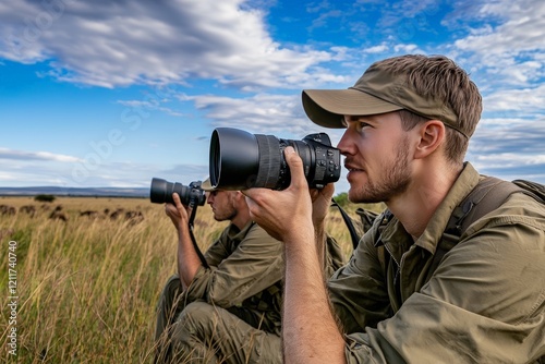 © authapol, Obraz premium Team of Wildlife Photographers Capturing Stunning African Savanna Moments in Conservation Efforts Amidst the Breathtaking Natural Landscape