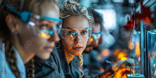 Obraz premium Team of young scientists working in a laboratory with protective glasses and focused expressions