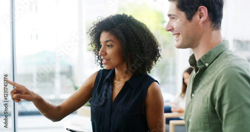 Obraz premium Team, planning and business people on glass board for brainstorming ideas in startup. Wall, cooperation and creative discussion in meeting with happy brand strategist for campaign or project schedule