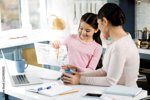 Fototapeta premium Team work. Serious glad girl demonstrating picture and woman holding cup