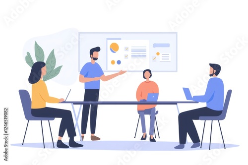 © Татьяна Евдокимова, Obraz premium Team working together on laptops in a meeting room while project manager explains strategy using whiteboard