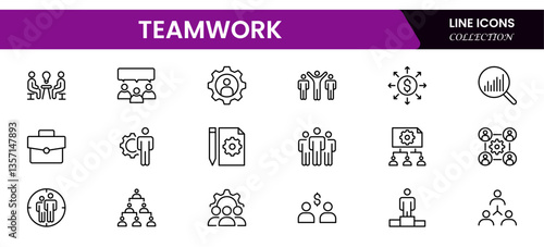 Fototapeta premium Teamwork linear icons collection. Set of coworking space icons. Business teamwork, team building, work group, and human resources minimal thin line web icon set.