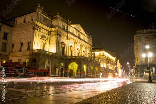Naklejka premium Teatro alla Scala (Theatre La Scala) at night in Milan, Italy. Light trails...