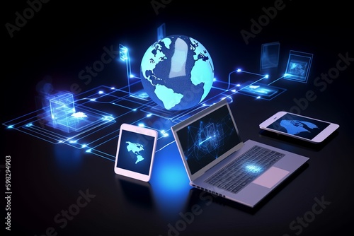 Fototapeta premium tech devices and icons connected to digital planet earth, communication concept, business network, business concept, laptop and globe, global communication concept, Generative AI
