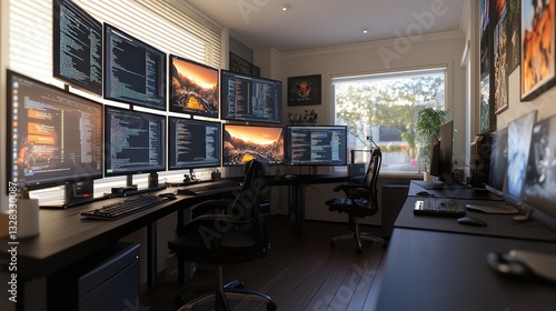 Fototapeta premium tech-focused home office environment where an IT developer uses multiple...