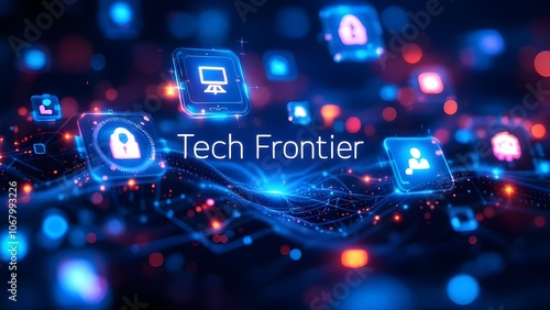 © Dackshina, Fototapeta premium Tech Frontier Digital Innovation Concept - Floating Technology Icons with Network Visualization in Neon Blue and Red