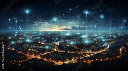 © Seksan, Fototapeta premium Tech satellite orbit, city evening, network nexus