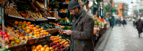Fototapeta premium Tech-Savvy Tablet Revolutionizes Fruit Selection Analysis at Market for...