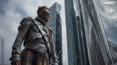 © Niroa, Fototapeta premium Tech Warrior in Futuristic Armor and Scottish Kilt