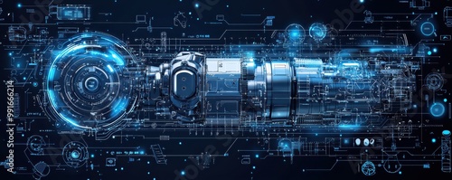 © Georgii, Obraz premium Technical blueprint background featuring futuristic machinery with glowing blue lines and intricate engineering details