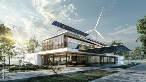 © Aeman, Obraz premium Technical drawings of a modern renewable energy plant with integrated solar and wind power systems