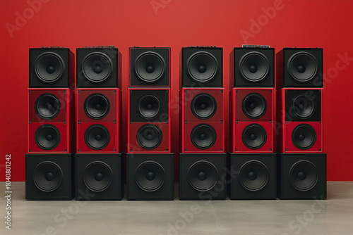 Obraz premium technical equipment, large stack of speakers in red and black color, red studio background, boxes, loudspeakers, photorealistic