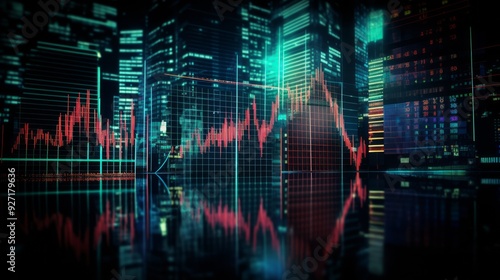 © mehaniq41, Fototapeta premium Technical price graph and indicator, red and green candlestick chart on blue theme screen. Neural network ai generated art