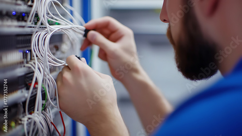 Fototapeta premium Technician meticulously connects and configures network cables within a data center, ensuring seamless connectivity & optimal performance of server infrastructure.
