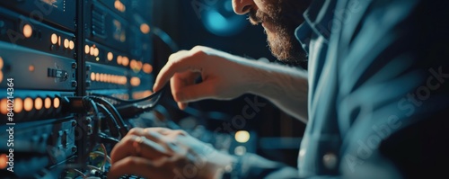 © Tanakorn, Obraz premium Technician working on a server room, adjusting wires and equipment. Concept of IT, technology, and technical support.