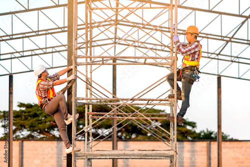 Fototapeta premium Technicians in safety clothing are climbing scaffolding. Friends go up and...