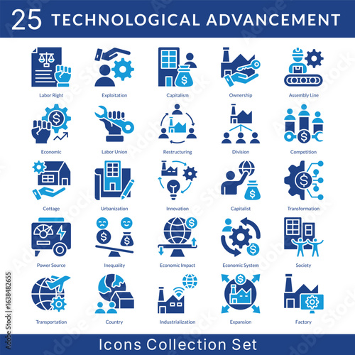 © Elzicon, Fototapeta premium Technological Advancement icon set collection in solid glyph ypstyle. an icon pack contain restructuring, division, competition, cottage, urbanization, innovation, capitalist, transformation