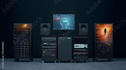 Naklejka premium Technological Equipment Setup Dark Room With Monitors Servers and Speakers...