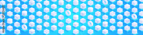 Obraz premium Technology background. Abstract futuristic cubes design and different geometric shapes. Digital innovation and artificial intelligence. Blockchain tech. Vector illustration in isometric view