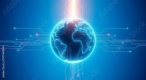 Obraz premium Technology background Glowing digital Earth with data streams and circuits on a blue background Keywords: earth, globe