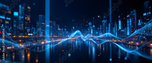 Fototapeta premium Technology background Modern city skyline illuminated at night with digital wave patterns reflecting on the water