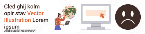 Fototapeta premium Technology challenges, online communication, frustration, connectivity issues, workflow disruption, virtual world. Person using laptop illustrated with globe, screen and sad face. Technology