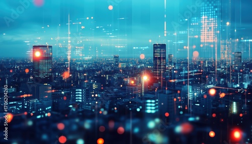 © Andrii, Fototapeta premium Technology Graphic Enhances Night Cityscape In Double Exposure Image Showcasing The Blend Of Urban Landscape With Digital Elements. A Striking Visual Composition.