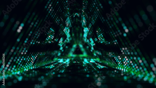 Fototapeta premium Technology green wireframe triangle tunnel on dark background. Futuristic 3D wormhole grid. Digital dynamic wave. 3d rendering.