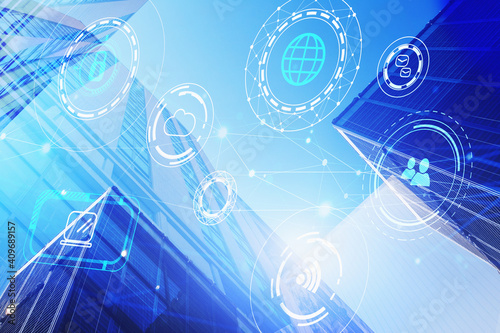 Naklejka premium Technology icons hologram on low, wide angle view of glass and steel contemporary skyscrapers in financial downtown. The concept of success in hi-tech industry. Double exposure.