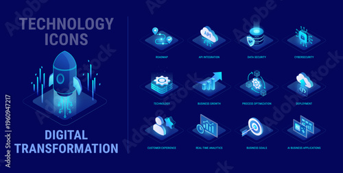 © forestgraphic, Naklejka premium Technology icons set for Digital Transformation workflow diagram - Roadmap, API integration, data security, process optimization, deployment, ai applications, analytics - high quality isometric vector