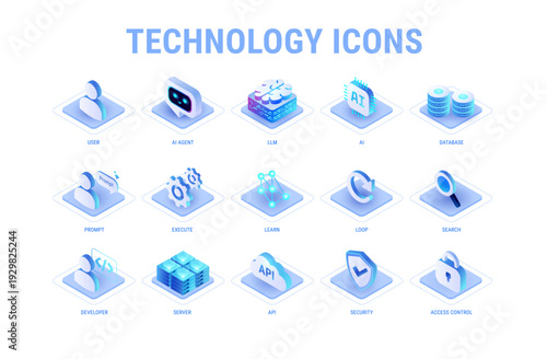 © forestgraphic, Obraz premium Technology icons set for workflow diagram light mode - AI and data, AI agent, machine learning, API cloud integration, server, database, security - high quality isometric vector on white background