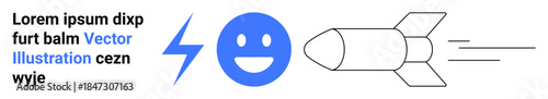 Fototapeta premium Technology, innovation, speed, communication, energy, progress. Blue happy face next to a lightning bolt and streamlined rocket graphic. Technology and innovation concept