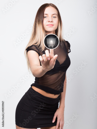 © sandyche, Fototapeta premium technology, internet and networking concept. beautiful woman in a short black skirt and a transparent top. woman presses shopping button on virtual screens