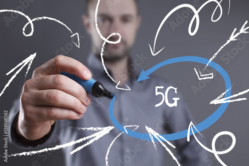 © photon_photo, Fototapeta premium Technology, internet, business and marketing. Young business man writing word: 5G