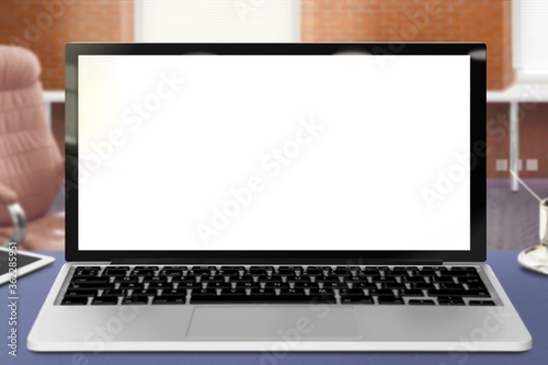 Fototapeta premium technology mockup - notebook with solid white empty display in the office room, made from real photography