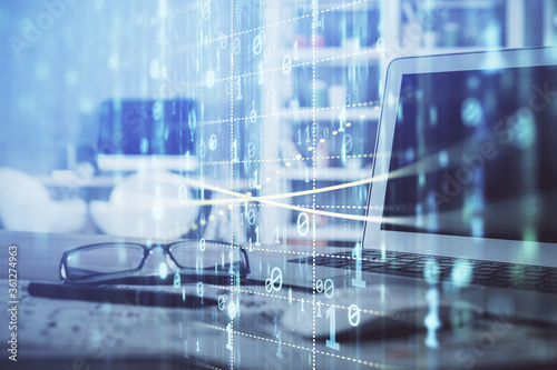 Fototapeta premium Technology theme drawing and table with computer. Multi exposure. Concept of information.