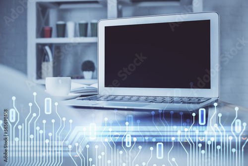 Fototapeta premium Technology theme drawing and table with computer. Multi exposure. Concept of information.