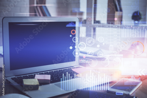 © peshkova, Fototapeta premium Technology theme drawing and work space with computer. Double exposure. Concept of innovation.