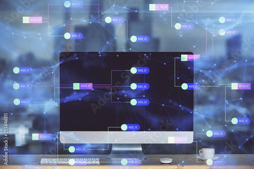 © peshkova, Fototapeta premium Technology theme drawing and work space with computer. Multi exposure. Concept of innovation.