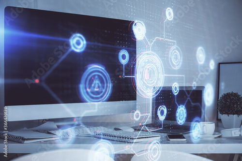 Fototapeta premium Technology theme drawing and work space with computer. Multi exposure. Concept of innovation.