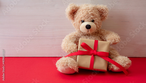 Obraz premium Teddy bear holding a gift box sitting on red floor. Valentines day.