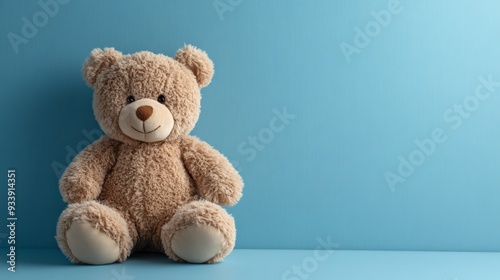© jirayut, Obraz premium Teddy bear sitting alone with a blue background