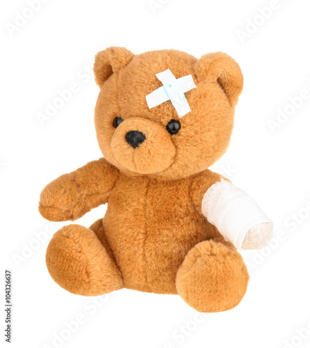 Fototapeta premium Teddy bear with bandage isolated on white, without shadow.