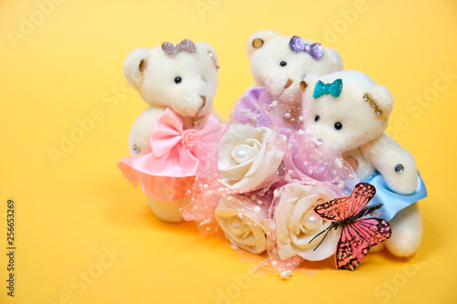 Obraz premium Teddy bears with roses and butterfly on yellow background. Toys